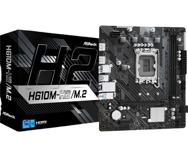 Asrock Intel LGA1700 H610M-H2 M.2 – Supports 14th, 13th 12th Gen Intel Core Processors (LGA1700) 3 1 1 Phase Power Design 2 x DDR4 DIMMs Supports Dual Channel, up to 3200 1 PCIe 4.0 x16, 1 PCIe 3.0 x1 Graphics Output Options: 2 HDMI Realtek ALC897 7.1 CH HD Audio Codec 4 SATA3, 1 Ultra M.2 (PCIe Gen3x4) 4 USB 3.2 Gen1 (2 Rear, 2 Front), 6 USB 2.0 (4 Rear, 2 Front) Realtek Gigabit LAN Supports ASRock Auto Driver Installer