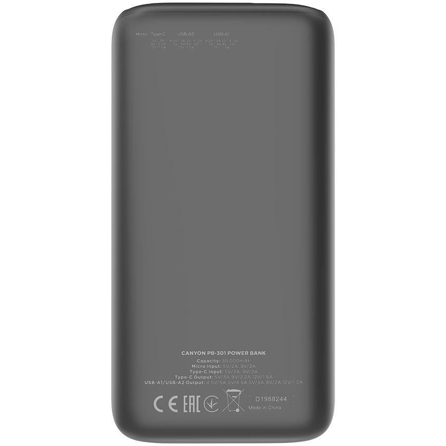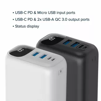 That’s a real powerhouse among power banks! The PB-301 stores a whopping 30000 mAh of electric juice for your devices. It has dual input ports: Type-C and MicroUSB, the latter one for the times when you need to keep it old-school. The USB-C port is both input and output, and it’s Power Delivery – meaning you can charge your power bank faster, too. Two USB-A ports support Quick Charge 3.0, making three output ports charge all your gadgets three times quicker. The built-in status display will tell you if fast charge mode is active and help you monitor the percentage of power left. We used the Smart IC technology in this power bank. This thing can detect your device and cable capacity and optimize voltage. It also protects your gadget from short-circuiting, overheating, and other threats. If you like to spend a lot of time off the grid, that’s your power bank of choice!