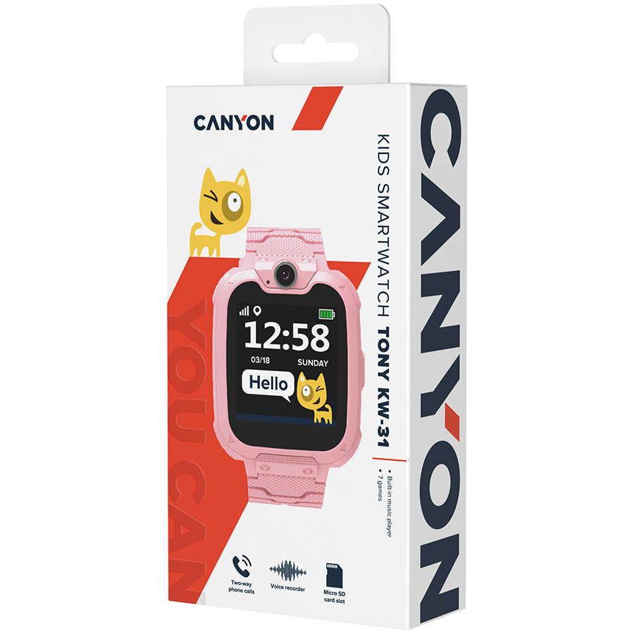 CANYON Tommy KW-31, Kids smartwatch, 1.54 inch colorful screen, Camera 0.3MP, Mirco SIM card, 32+32MB, GSM(850/900/1800/1900MHz), 7 games inside, 380mAh battery, compatibility with iOS and android, red, host: 54*42.6*13.6mm, strap: 230*20mm, 45g