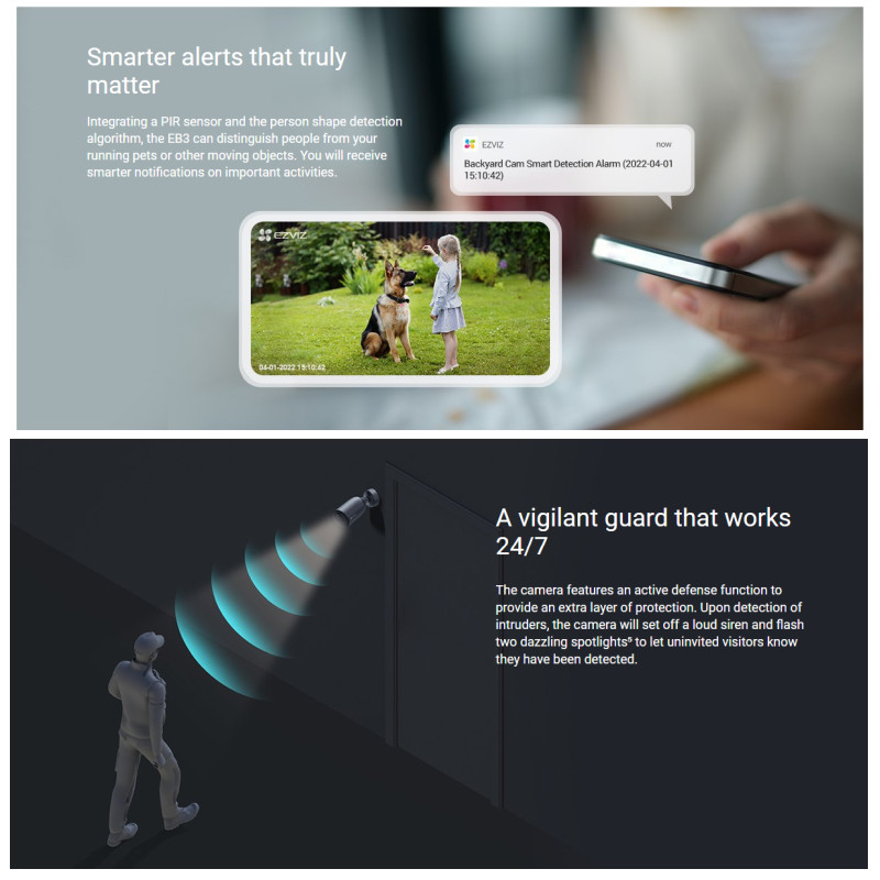 – Integrating a PIR sensor and the person shape detection algorithm, the EB3 can distinguish people from your running pets or other moving objects