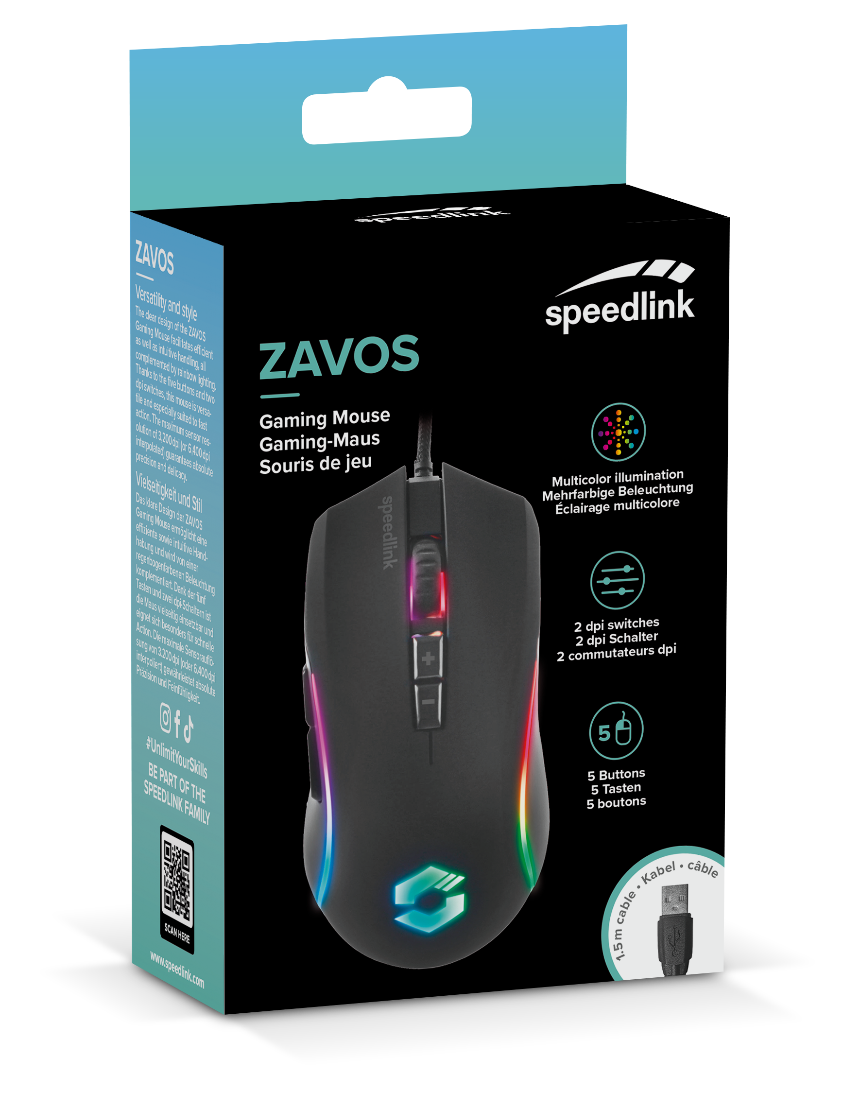 Svestranost, preciznost i stil glavne su značajke ZAVOS RGB miša za igre. Jasan dizajn omogućuje učinkovito i intuitivno rukovanje i nadopunjen je RGB osvjetljenjem duginih boja. Zahvaljujući pet gumba i dva dpi prekidača, miš je svestran i posebno pogodan za brzo djelovanje. Maksimalna razlučivost senzora od 3.200 dpi (ili 8.000 dpi interpolirano) osigurava apsolutnu preciznost i osjetljivost tako da čak i najmanje mete mogu biti sigurno ciljane. Zbog gumirane površine ZAVOS-a savršeno prianjanje je zajamčeno u svakom trenutku, čak i na znojnim misijama. Prekriveni kabel dužine 1,5 metara je robustan, elegantan i ostavlja dovoljno prostora za sve vrste manevara.Podešavanje RGB LED dioda po želji, definiranje makroa, spremanje dodjele tipki i raznih profila moguće je zahvaljujući softveru.