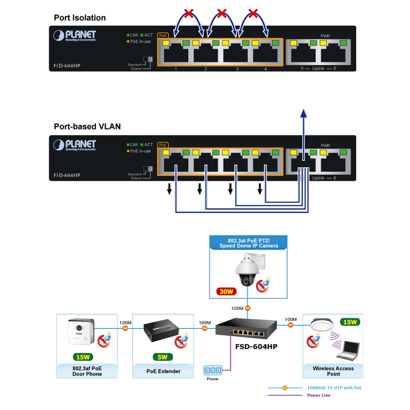 * PLANET FSD-604HP Desktop Switch provides four 802.3at PoE+ ports for catering to small-scale IP surveillance networks at a lower total cost