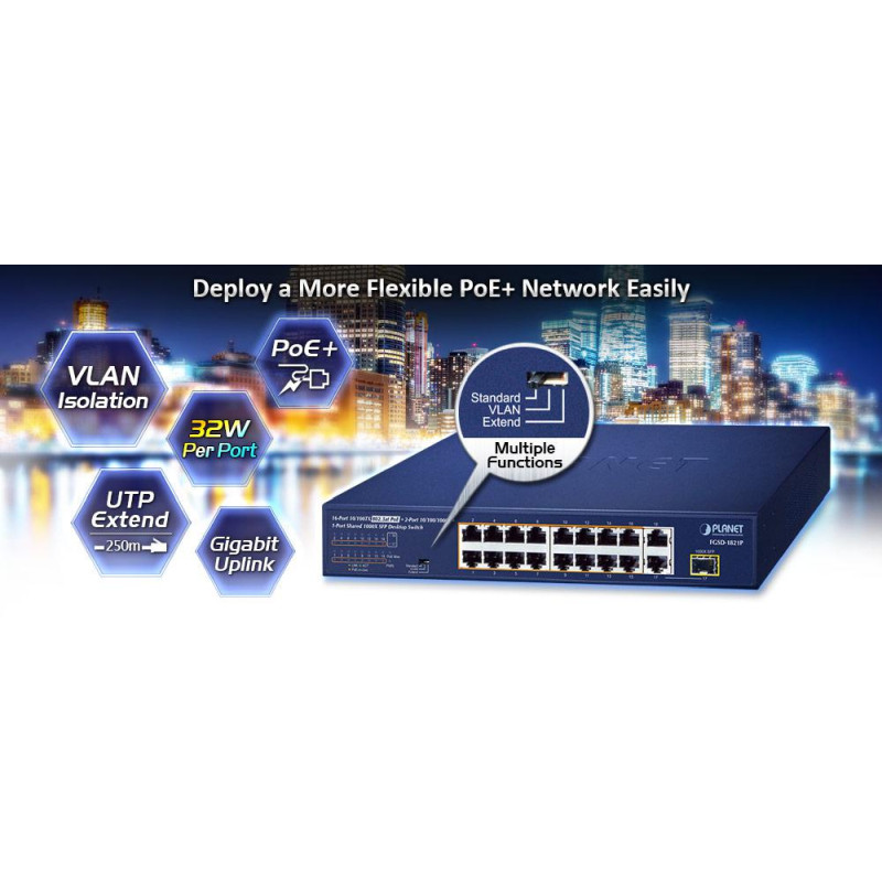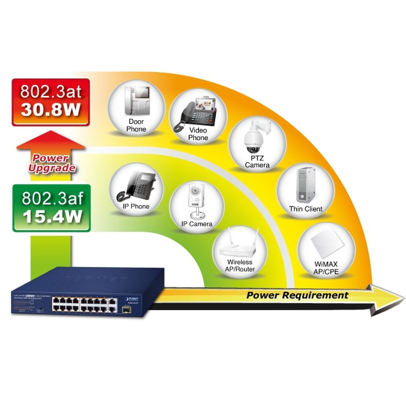 – Supports PoE power up to 32 watts for each PoE port, with a total PoE budget of 185W