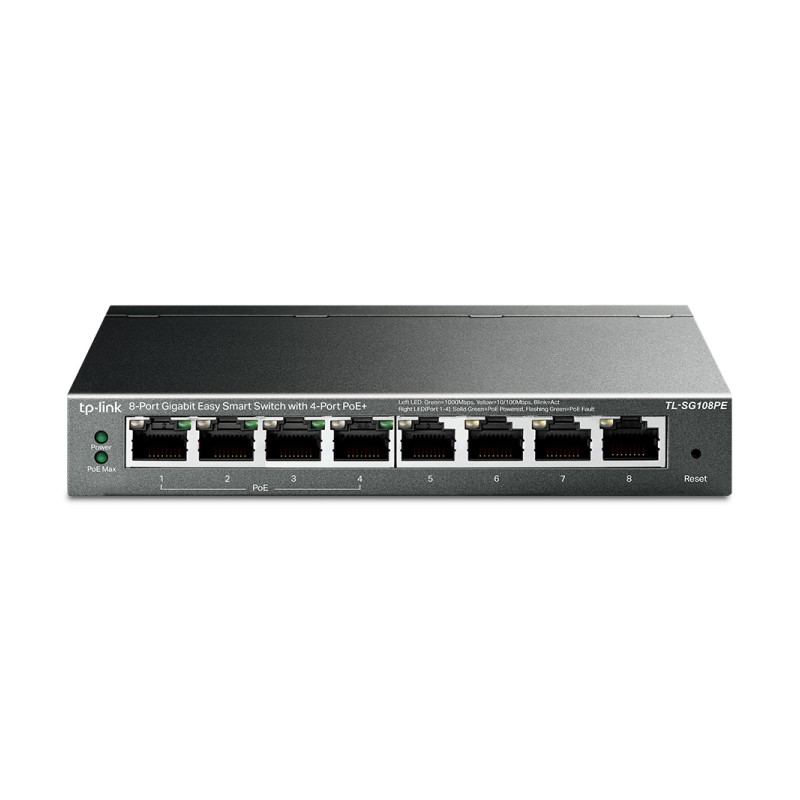 – Package Contents: TL-SG108PE, Power Adapter, Installation Guide, Rubber Feet