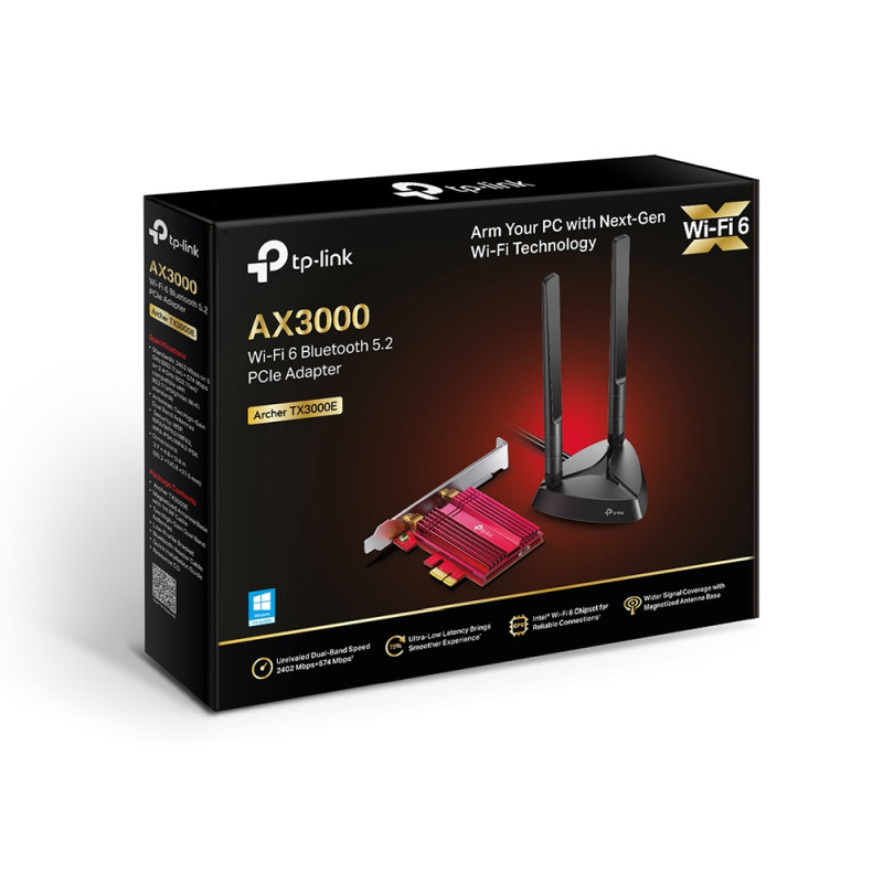 – Package Contents: Archer TX3000E, Magnetized Antenna Base with 1m RF Cable, Two 5 dBi High Gain Antennas, Low-Profile Bracket, Bluetooth Header Cable, Quick Installation Guide, Resource CD