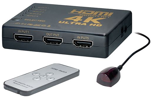 Transmedia CS1-5L 5-way HDMI Switch 4K@30Hz – with IR- remote control, with external IR-receiver Media devices INVISIBLY STOW and control it remotely. Switches 5 different sources to your monitor via IR remote control. 5 inputs, 1 output, Multi-switching methods: IR remote or by touch button, supports 4K (2160P@30Hz), 3D and Full HD (1080p), supports uncompressed audio such as LPCM, supports HDCP, supports 16 bit per channel (48bit all channel) deep color, supports 340 MHz 3.4 Gbps per channel (10.2 Gbps all channel) bandwidth, incl. switch, IR receiver cable, remote control and USB cable for power supply (not required for most device combinations)