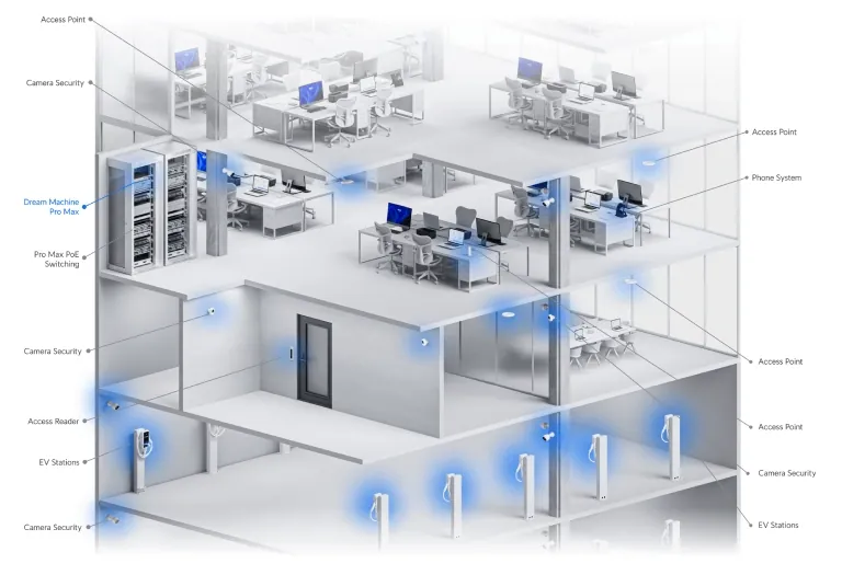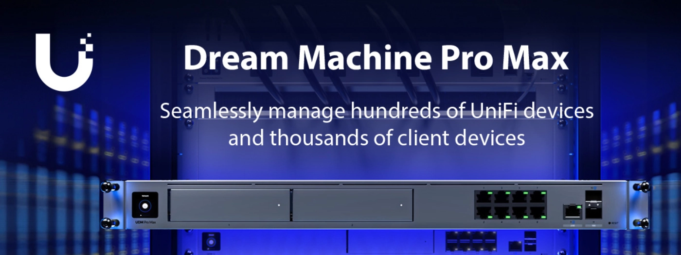 Dream Machine Pro Max is a second – generation Dream Machine that is all about scale. It’s been entirely redesigned to accommodate larger and more complex networks. Now featuring double the compute resources, it efficiently manages hundreds of UniFi devices and seamlessly supports thousands of client devices.