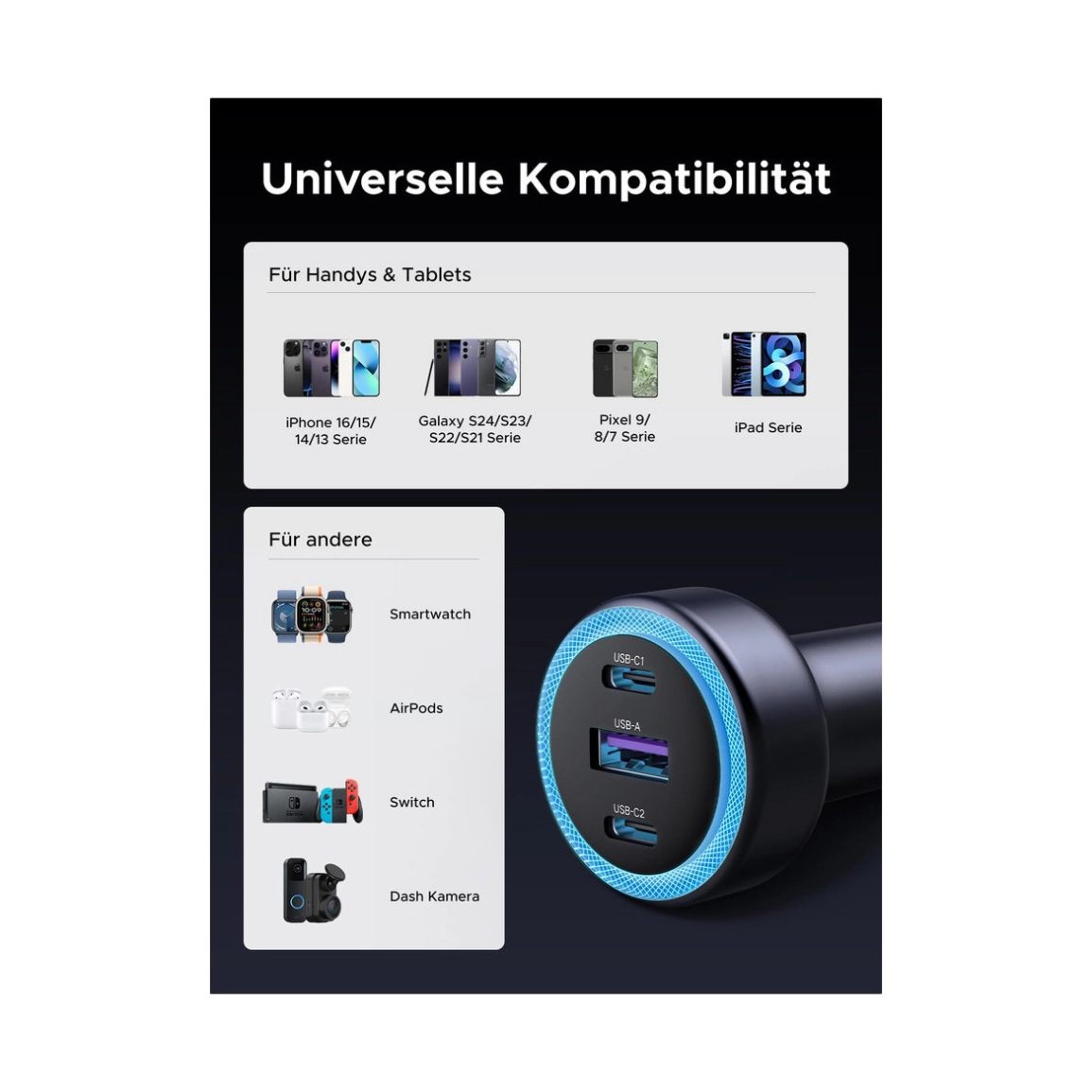 Raznovrsna kompatibilnost za vozila i uređaje: Punjači za automobile s 3 ulaza karakterizira njihova svestrana kompatibilnost Kao dodatak za automobil s upaljačem za cigarete USB C, podržava brojne uređaje kao što su iPhone 16/16 Pro/16 Pro Max/15/15 Pro/15 Pro Max/14/14 Pro/14 Pro Max/13/13 Pro/12/12 Mini/SE 2022/2020, Galaxy S24, iPad mini. 7/Pro/Air, tableti, MacBook Pro 16in, Watch 10 i GPS navigacija, e-knjige, igraće konzole, zvučnici, MP3 itd.