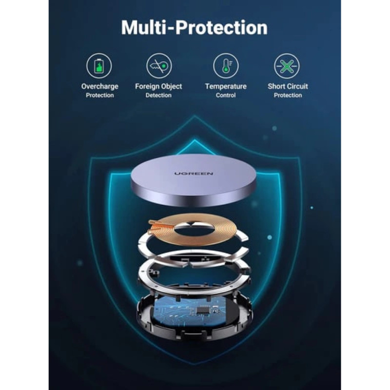 – UGREEN magnetski bežični punjač s savršeno raspoređenim magnetima pričvršćuje se na vaš iPhone 17/17 Pro/17 Pro Max, 16/16 Pro/16 Pro Max, 15/15 Pro/15 Pro Max 14/14 Pro/14 Pro Max, 13/13 Pro/13 Pro Max/13 Mini, 12/12 Pro/12 Pro Max/12 Mini i AirPodsi i osigurava brže bežično punjenje. Uređaj možete jednostavno postaviti na slobodne položaje, a bežični punjač će ubrzati vaš iPhone.