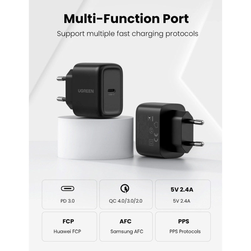 UGREEN zidni punjač 25W, USB-C, PD3.0/QC4.0, crni + USB-C/USB-C kabel 2.0m
