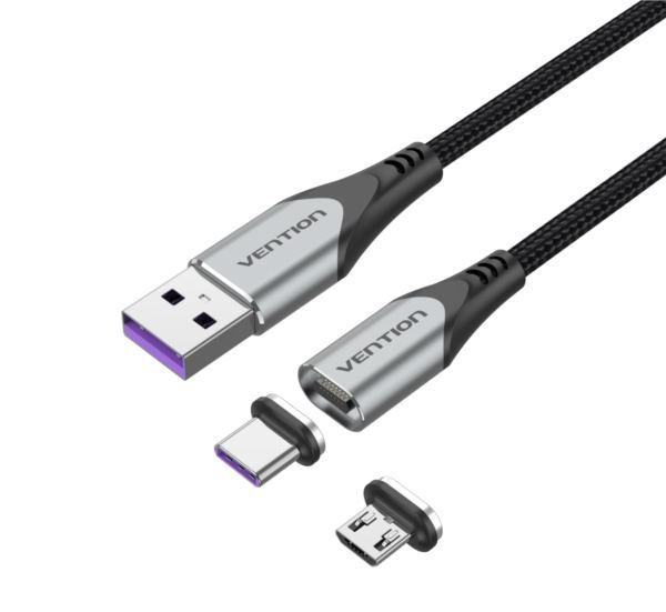 Vention USB 2.0 A Male to 2-in-1 Micro-B USB-C Male 5A Magnetic Cable 2m, Gray – Interface: Nickel-plated Shell: Aluminum Alloy Conductor: Tinned Copper Transmission rate: 480Mbps Rated current: 5A